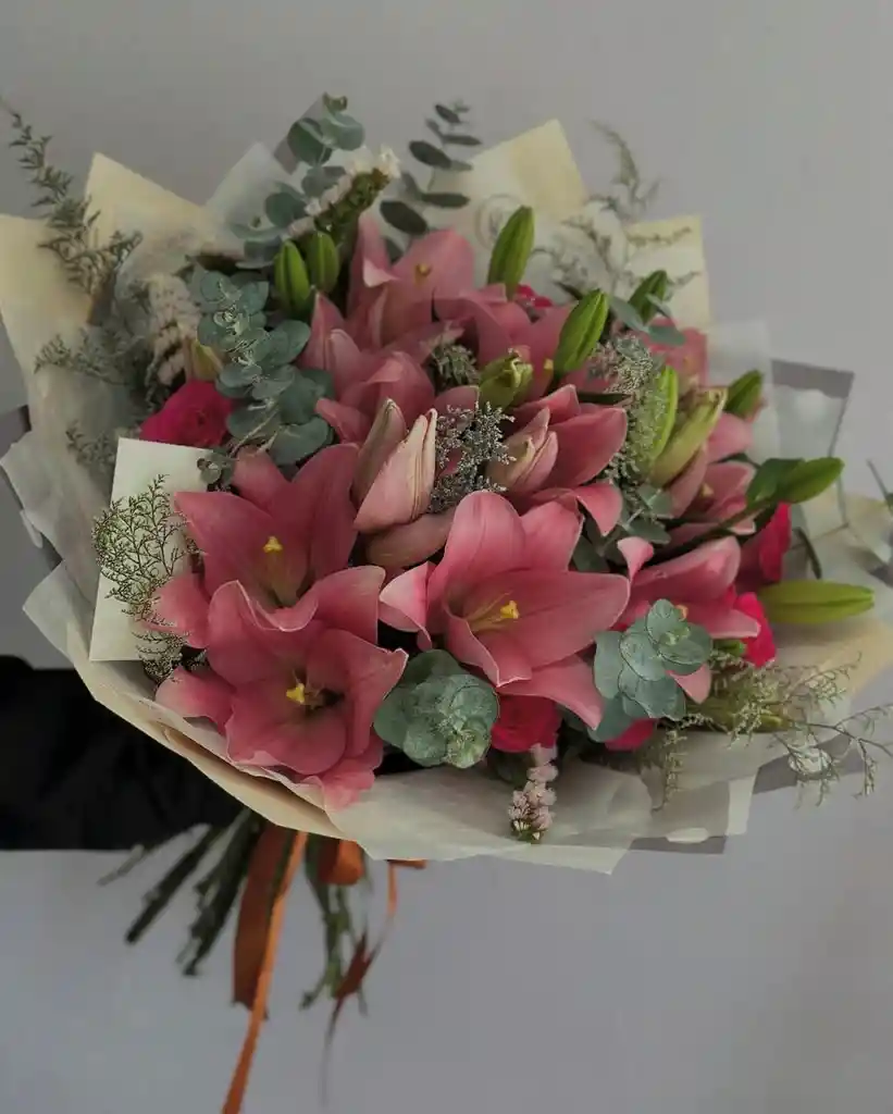 Este elegante ramo combina la delicadeza de los lirios rosados con la frescura de los capullos verdes, creando un contraste armonioso con rosas fucsia y follaje de eucalipto. Está envuelto con papel en tonos marfil y gris suave, que resaltan la belleza natural de las flores. Es un arreglo sofisticado y romántico, ideal para expresar amor, admiración o gratitud.