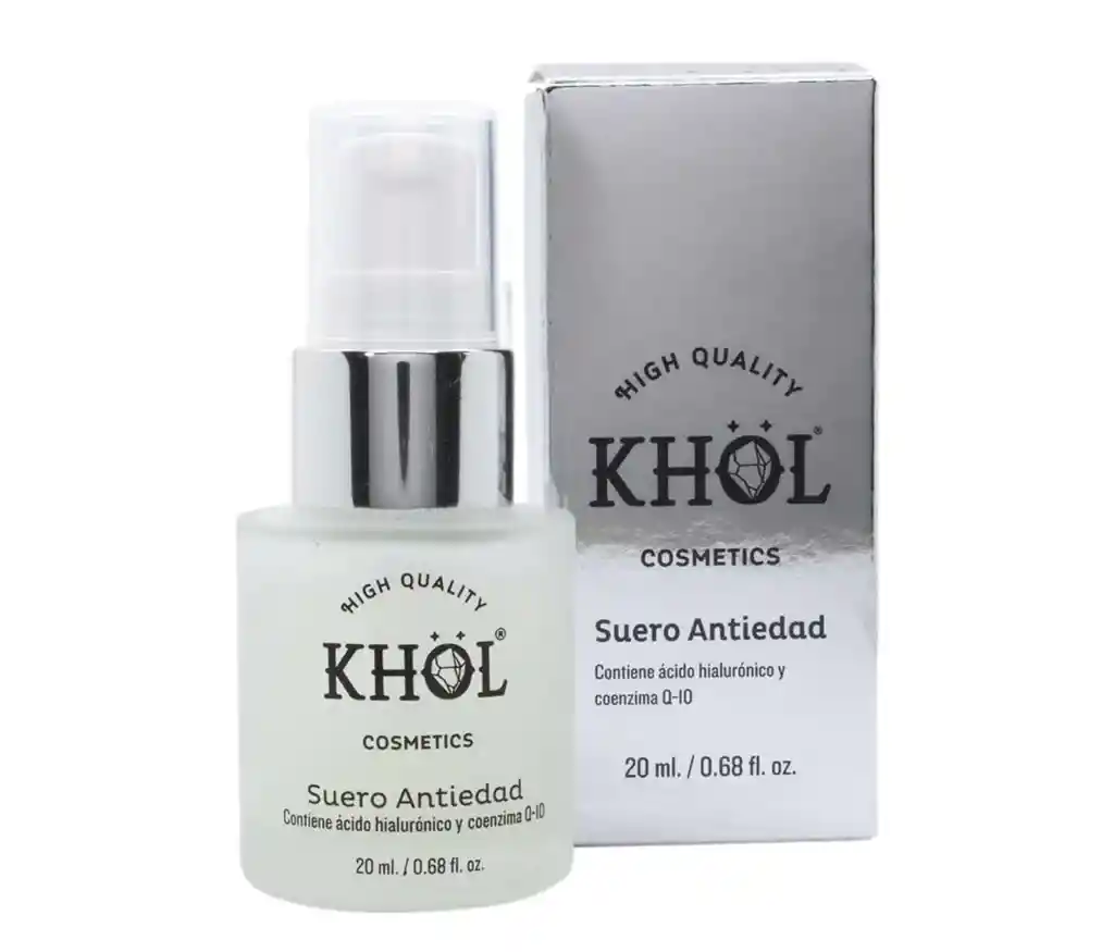 El Suero Antiedad Khöl Cosmetics ha sido formulado con dos de los componentes antiedad más reconocidos en la actualidad: El Ácido Hialurónico el cual ayuda a retener agua y a que esta penetre en lo más profundo de las arrugas para disminuir las líneas de expresión y la Coenzima Q10, reconocida por su gran poder antioxidante, que ayuda a combatir y prevenir el daño causado en tu piel por factores como la contaminación y los radicales libres. El Suero Antiedad Khöl Cosmetics es perfecto para usar de día y de noche, ya que su fórmula es rápidamente absorbida y asimilada por la piel, sin dejar sensación grasosa
