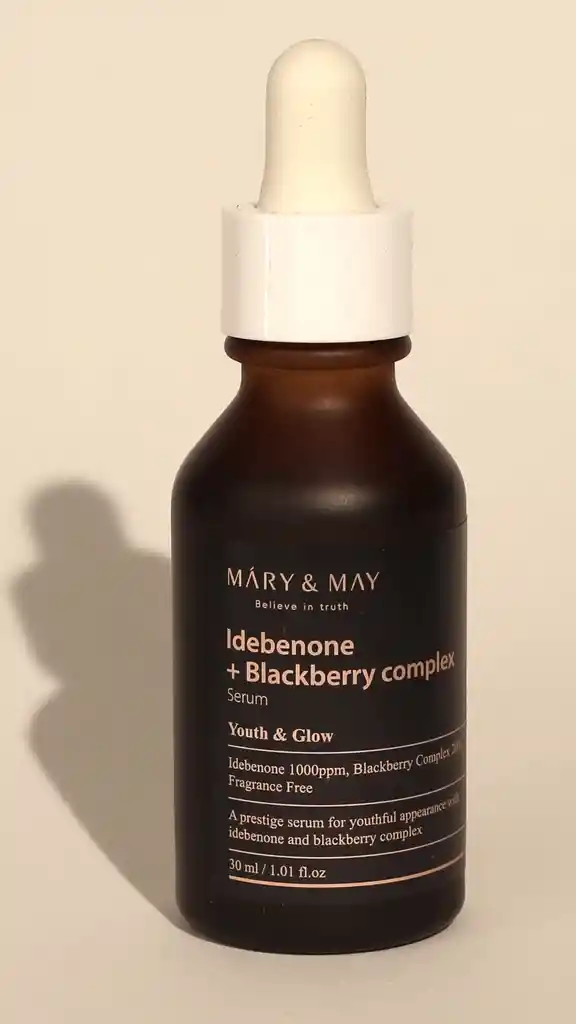 Beneficio Complejo de Idebenona desarrollada originalmente como un tratamiento para el Alzheimer, la idebenona es el antioxidante para la piel más poderoso presentado por la Asociación Estadounidense de Dermatología y tiene un efecto antioxidante cuatro veces mayor que la vitamina C y 10 veces mayor que la coenzima Q10. Las moras, una fruta de color azul oscuro, son ricas en antocianinas para eliminar el oxígeno activo y prevenir el envejecimiento. La idebenona no era fácilmente soluble en disolventes, por lo que era difícil utilizarla como ingrediente cosmético. Mary & May Idebenone maximiza el efecto antioxidante de Idebenone mediante el uso de materias primas con la tecnología adecuada para aumentar la solubilidad de los solventes y la tasa de penetración en la piel. Las antocianinas, que abundan en las frutas de color púrpura oscuro o azul oscuro, son los antioxidantes más poderosos de 150 especies de flavonoides, eliminando el oxígeno activo causado por la oxidación de las células para prevenir el envejecimiento. Mary & May maximizaron la sinergia de los efectos antioxidantes con la idebenona al formar complejos con extractos de acaiberry, arándanos y moras, también conocidos como el fruto de la vida. El color naranja del suero de idebenona es el color de la materia prima de la idebenona, no un pigmento artificial, lo que lo hace seguro y permite una absorción suave en la piel sin la sensación de pegajosidad al aumentar la tasa de penetración de la piel. Masajea suavemente durante la etapa de esencia para dar una sensación de hidratación a la piel. Ayuda a mejorar la elasticidad de la piel y a aclarar el tono de la piel. ¿Cómo lo aplico? Aplica dos o tres gotas en el rostro evitando la zona de los ojos y la boca. Extiende uniformemente y masajea para una máxima absorción. Recomendación no toques tu piel con el gotero, para evitar contaminar el producto. Paso de la rutina 6 ¿Cada cuánto? Lo puedes implementar en tu rutina de día o de noche, después de la esencia o tónico y antes de tu crema. Componentes Agua, extracto de fruta de Rubus Fruticosus (mora) (20 %), extracto de fruta de Euterpe Oleracea, extracto de fruta de Vaccinium Angustifolium (arándano), glicerina, triglicérido caprílico/cáprico, glicereth-26, 1,2-hexanodiol, butilenglicol, poliglicerilo-10 Laurato, hidroxidecil ubiquinona (1000 ppm), lecitina hidrogenada, arginina, carbómero, etilhexilglicerina, caprilil glicol.