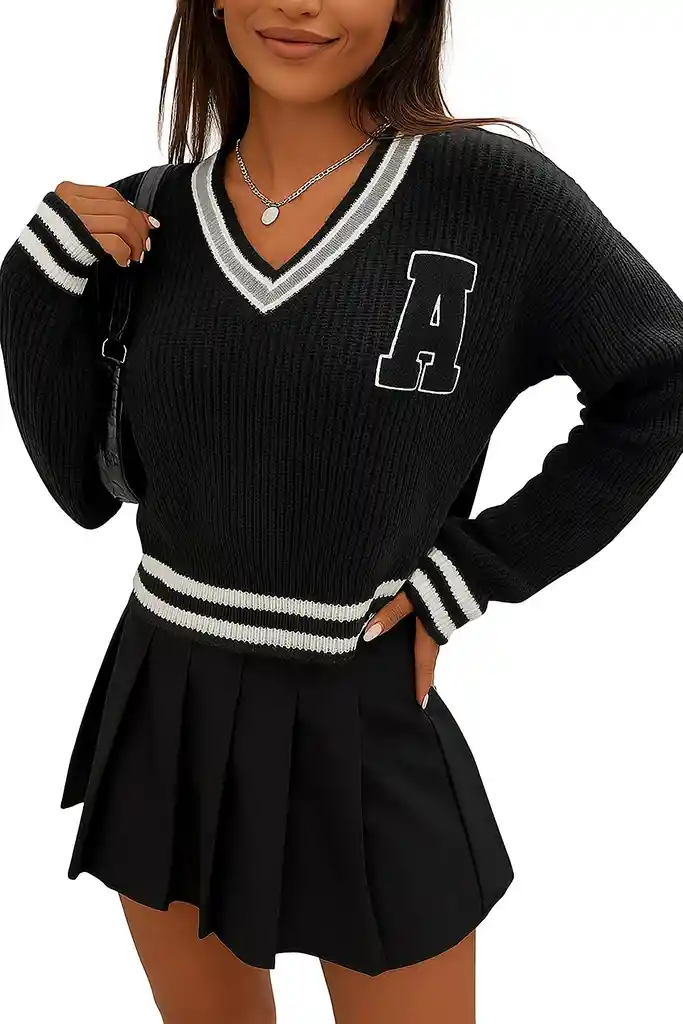 Suéter Para Mujer Con Bordado De Letras Parcheadas Y Ribete A Rayas