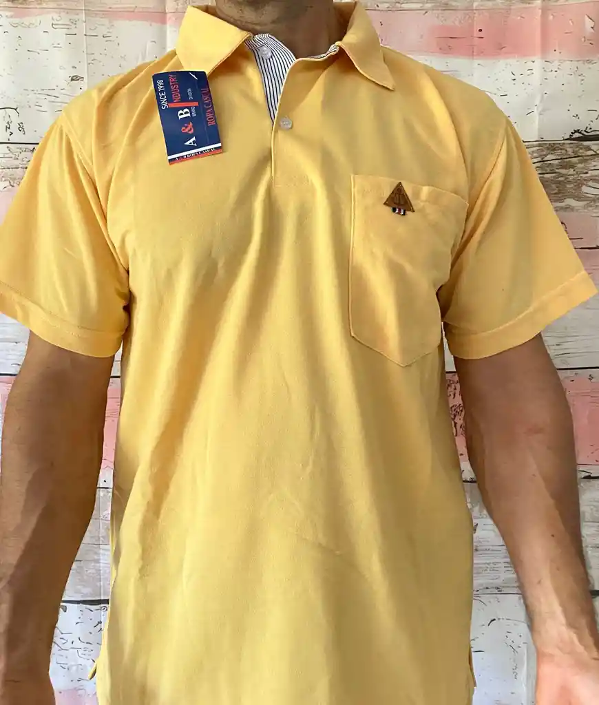 Suéter tipo polo para hombre, con cuello de dos botones, con bolsillo izquierdo, detalle en manga, cuello y bolsillo. Color: Amarillo Talla: L. Tela: algodón suave y fresco. Adecuado para cualquier ocasión, casual, formal, para combinar con bermudas, jeans o pantalón clásico. elegancia que se nota. Presencia que impacta.
