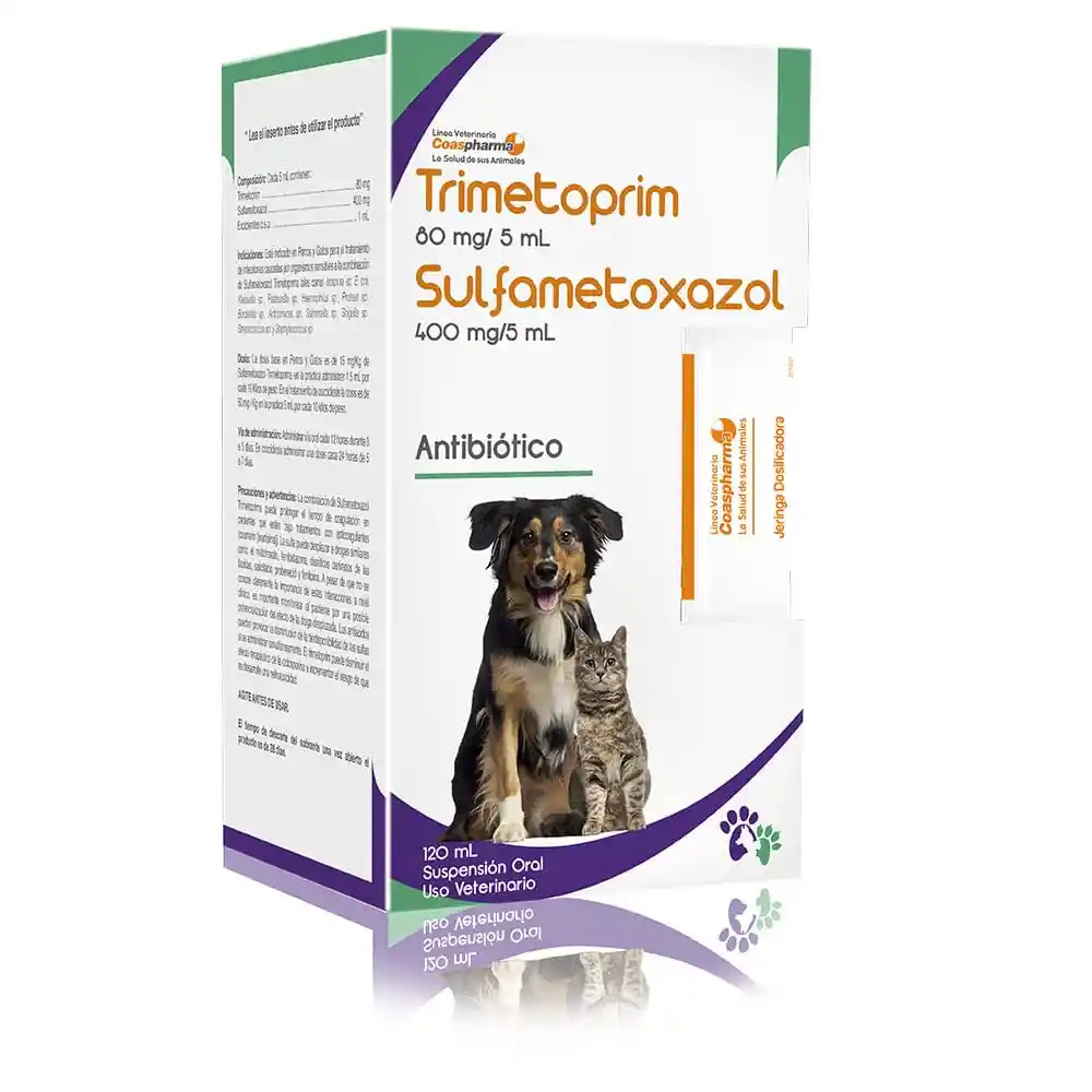 Antimicrobiano de amplio espectro para perros y gatos. INDICACIONES: Antimicrobiano y antiprotozoario sinérgico de amplio espectro para el tratamiento de infecciones dermatológicas, respiratorias, digestivas y genitourinarias causadas por gérmenes susceptibles a los principios activos de la fórmula.
