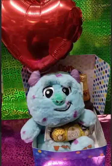 sulivan modelo contiene * caja de carton diseño feliz dia * cerveza modelo * peluche sulivan de 20cm * ferrero x 3 unidades * globo y moño