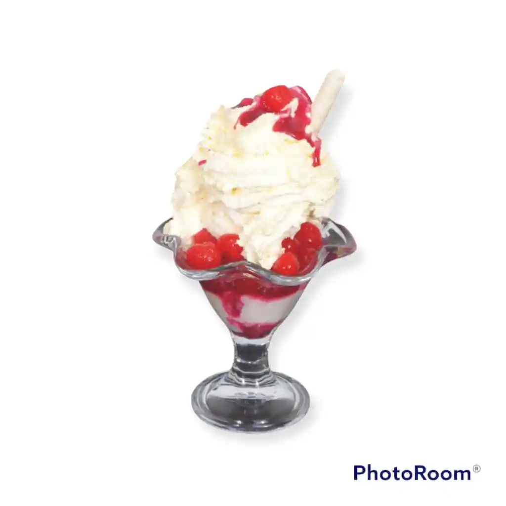 Helado de vainilla acompañado de cerezas, salsa, chantilly y barquillo.