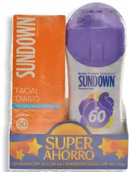 Sundown protector solar corporal 50+protector solar facial factor 60. Presentación 1 caja con 1 unidad de 120ml y la 2 unidad de 50 gr. Packing: Sin Packaging