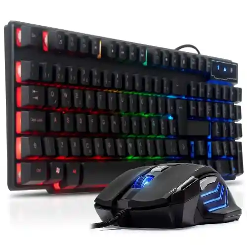 DALE UN TOQUE ESPECIAL A UN MAQUINA Luces RGB MULTICOLOR Edición Especial Mouse & teclado con iluminación multicolor, ademas de ser ergonómicos reduciendo la probabilidad de sindrome de túnel carpiano. Color negro mate con iluminación multicolor. Fabricado en materiales de alta resistencia Ideal para computadores de mesa o como teclado auxiliar en portátiles. - 3 tipos de retroiluminación, movimiento preciso y suave de cada tecla, mayor comodidad. Descripción. MOUSE : cable de 1.5 metros y conexión USB, sensor óptico. TECLADO con 104 teclas y conexión USB 2.0 con cable de 1.5 metros, diseño semi mecánico.