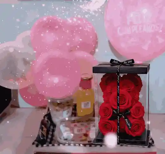 Contenido: Ancheta+ Oso de Rosas Rojo 1 Mini Postre de Cumpleaños 1 Jugo Natural de Naranja 4 Chocolates Speciales 2 Galletas 1 Yogurt 1 Maní 1 Granola 1 Bandeja de Frutas 1 Sándwich jamón y Queso, Vegetales 1 Hermosa Decoración de Globos 1 Bandeja de Desayuno Decorada 1 Hermosa decoración