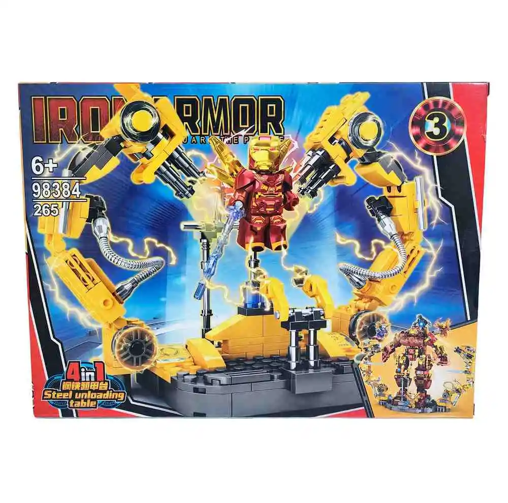El set de construcción Iron Armor 4 en 1 es perfecto para los pequeños fanáticos de los superhéroes y la tecnología. Incluye 265 piezas con las que se pueden crear escenas de laboratorio, brazos robóticos articulados y una figura de héroe con armadura dorada y roja. Su diseño permite múltiples configuraciones para recrear momentos de acción y ensamblaje de trajes tecnológicos. Ideal para niños mayores de 6 años, fomenta la creatividad, la coordinación y el gusto por la construcción con un toque de aventura futurista. Ficha Técnica: Dimensiones : 34 cm x 25 cm x 5 cm Material: Plástico ABS Edad recomendada + 6 Años Referencia: JM-1376 98384 Certificado de conformidad: CS-LCO-13233-2021S2/432 ** _Para defectos de fábrica o retractos: \_Por favor revise el producto apenas lo reciba y antes de usarlo. No aplican ley de retracto o defectos de fábrica luego de usar el producto. Se manejan máximo 5 días para reportar defectos de fábrica (por ejemplo, producto funciona mal, piezas faltantes, rotas, etc). Para hacer efectiva la devolución el producto debe devolverse con el empaque original, el cual debe estar en buen estado, incluir todos los documentos y las partes completas y sin daños.