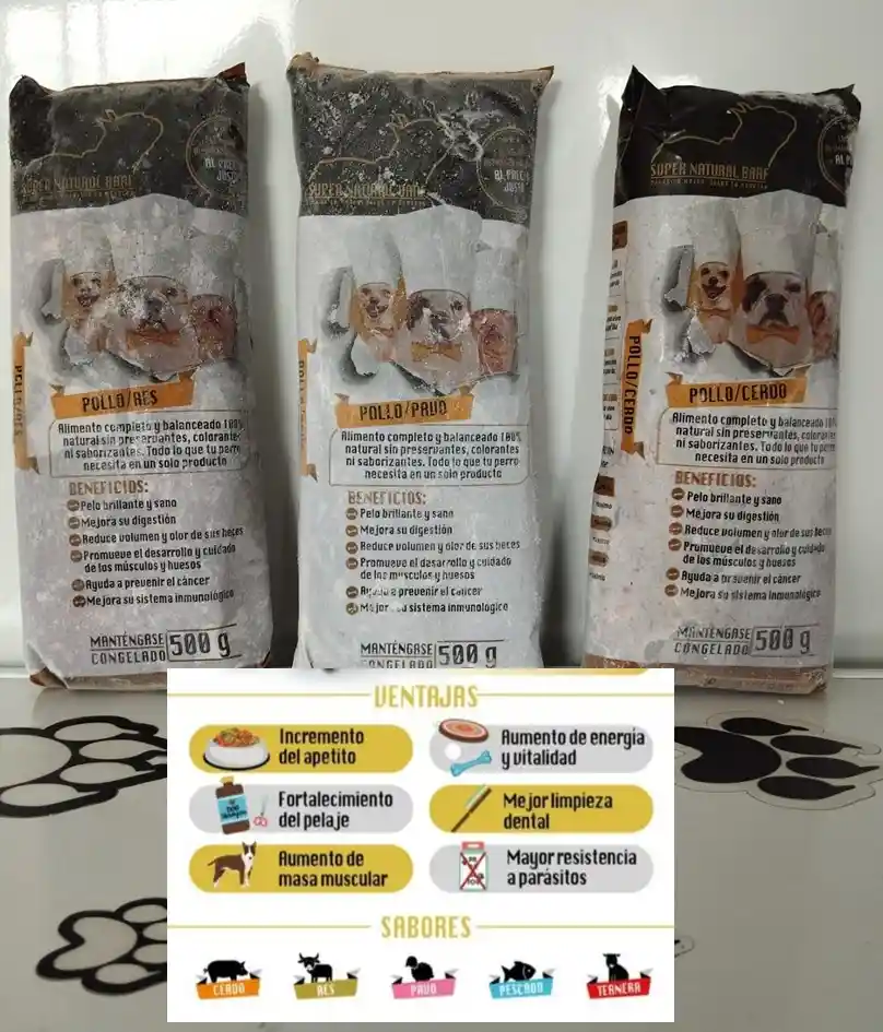 Super Natural Barf es un alimento completo y balanceado 100% natural sin preservantes, colorantes ni saborizantes. Todo lo que su perro necesita en un solo alimento. 10 libras en cinco sabores surtidos (2 libras x sabor)
