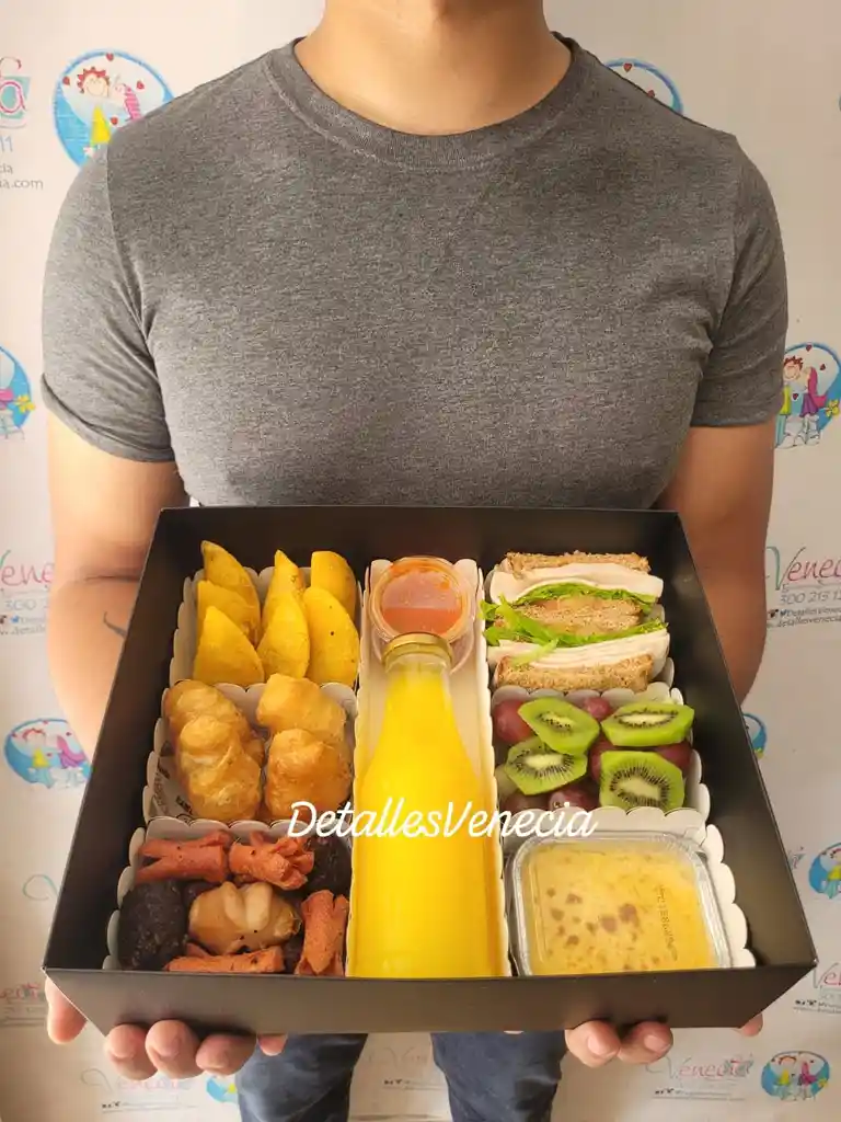 Hermosa y deliciosa caja sopresa para PAPÁ, disponible del 13 al 15 de Junio, para el dia del Padre. Contiene: Empanas de pollo y carne (tipo pasabocas) Palos de queso pequeños Morcilla, salchicha, burtifarra o (Chorizo) Sanduche Jamon y Queso Mix de frutas Postre Jugo de Naranja Salsas En caja decorada dia del Padre, moño