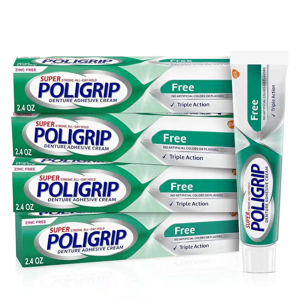 La crema adhesiva para dentaduras súper Poligrip libre ofrece una fuerte sujeción de 12 horas que sella hasta un 74 % más de partículas de alimentos (en comparación con ningún adhesivo después de 1 hora en una dentadura completa inferior) La crema adhesiva para dentaduras postizas cuenta con una fórmula libre de zinc