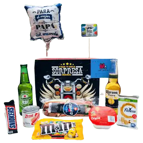 Este Súper Regalo Papá trae: Cerveza Corona (350ml) Cerveza Heineken (330 ml) Papas Pringles pequeñas Galletas tosh o fitness Chocolates m&m Salchichas Zenu Chocolatina Snickers Sándwich Globo metalizado Letrero Día del Padre Hermosa Caja decorativa