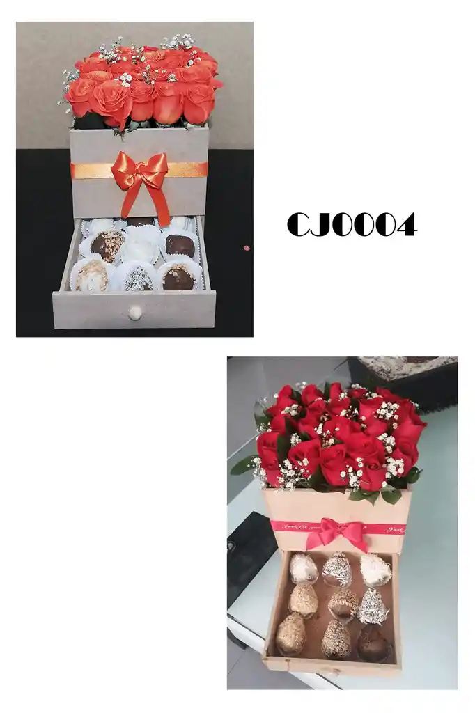 Caja de 25 rosas en madera con 9 fresas medidas aproximada 25*25*25cm