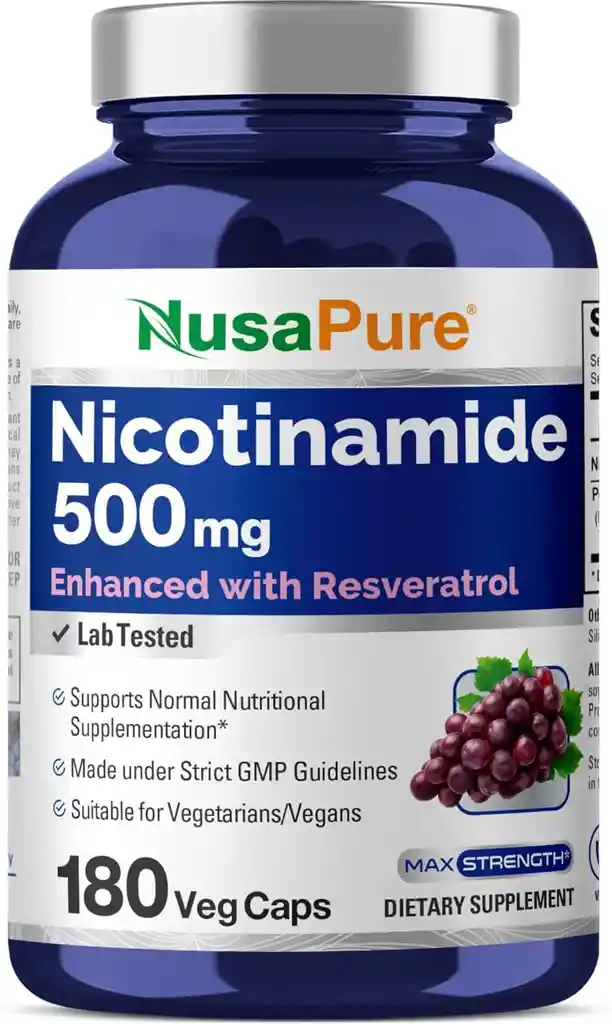 Suplemento Nusapure Nicotinamide 500mg Con Resveratrol 180 Cápsulas Veganas Salud Piel