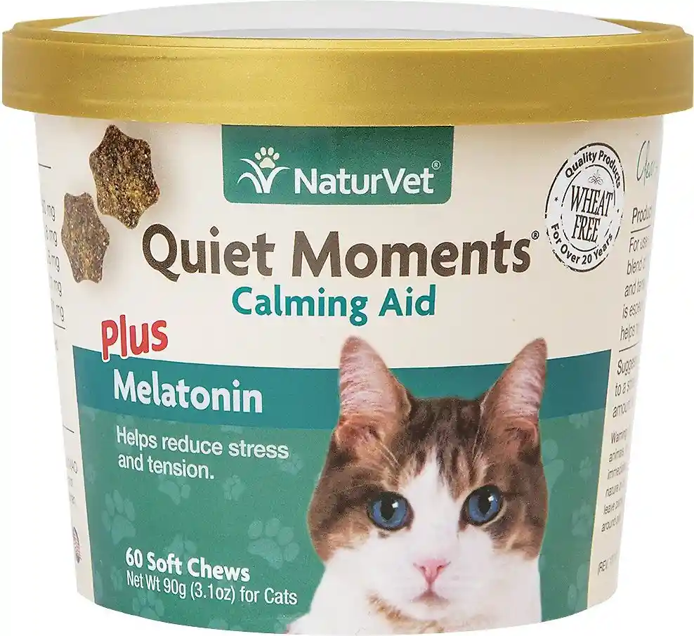 Ayuda a calmar la ansiedad de tu gato y siéntete cómodamente tranquilo con la ayuda calmante NaturVet Quiet Moments. Estos sabrosos masticables son una solución natural para calmar a tu mascota y están reforzados con melatonina, una sustancia química natural que el cuerpo produce antes de acostarse. La mezcla única de tiamina y L-triptófano de NaturVet ayudará a reducir el estrés y la tensión, mientras que el jengibre es compatible con los estómagos sensibles. Esta combinación ayuda a promover el descanso y la relajación, especialmente durante viajes, tormentas o visitas al veterinario.