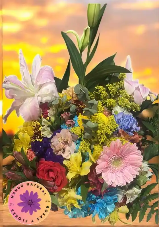 Un arreglo abundante y lleno de color que destaca por la presencia elegante de lirios, acompañados de una variedad de flores frescas surtidas. Perfecto para sorprender en ocasiones especiales con un detalle impactante, lleno de vida y significado