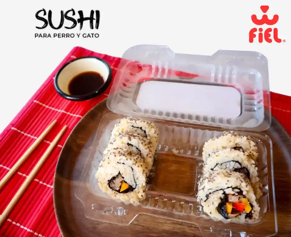 Delicioso sushi con una mezcla de frutas frescas, filete de merluza y arroz, acompañado de salsas especiales; bocados saludables y exquisitos para caninos y felinos de todas las edades y razas.