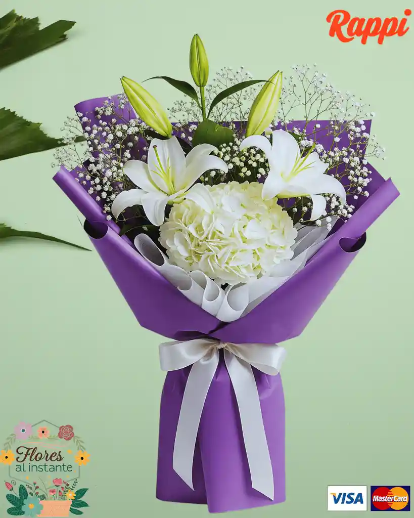 Un bouquet que irradia pureza y elegancia. Envuelto en un sofisticado papel coreano, este arreglo combina la majestuosidad de 2 lirios blancos con la delicadeza de 1 hortensia blanca. La gipsófila y las hojas de rusco le dan un toque extra de frescura y volumen, creando una composición armoniosa y llena de encanto.