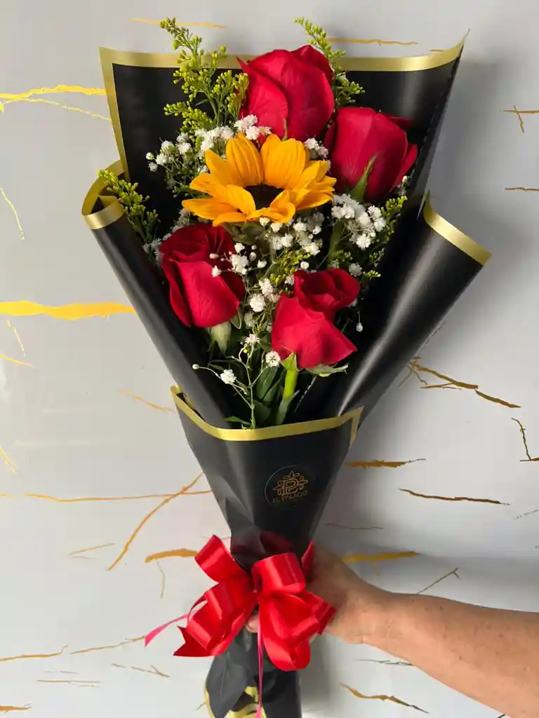 Un detalle que enamora: cuatro rosas premium que abrazan la luz de un girasol radiante, envuelto en delicado papel coreano y con un moño encantador. perfecto para cualquier ocasión, san valentin.... cumpleaños...