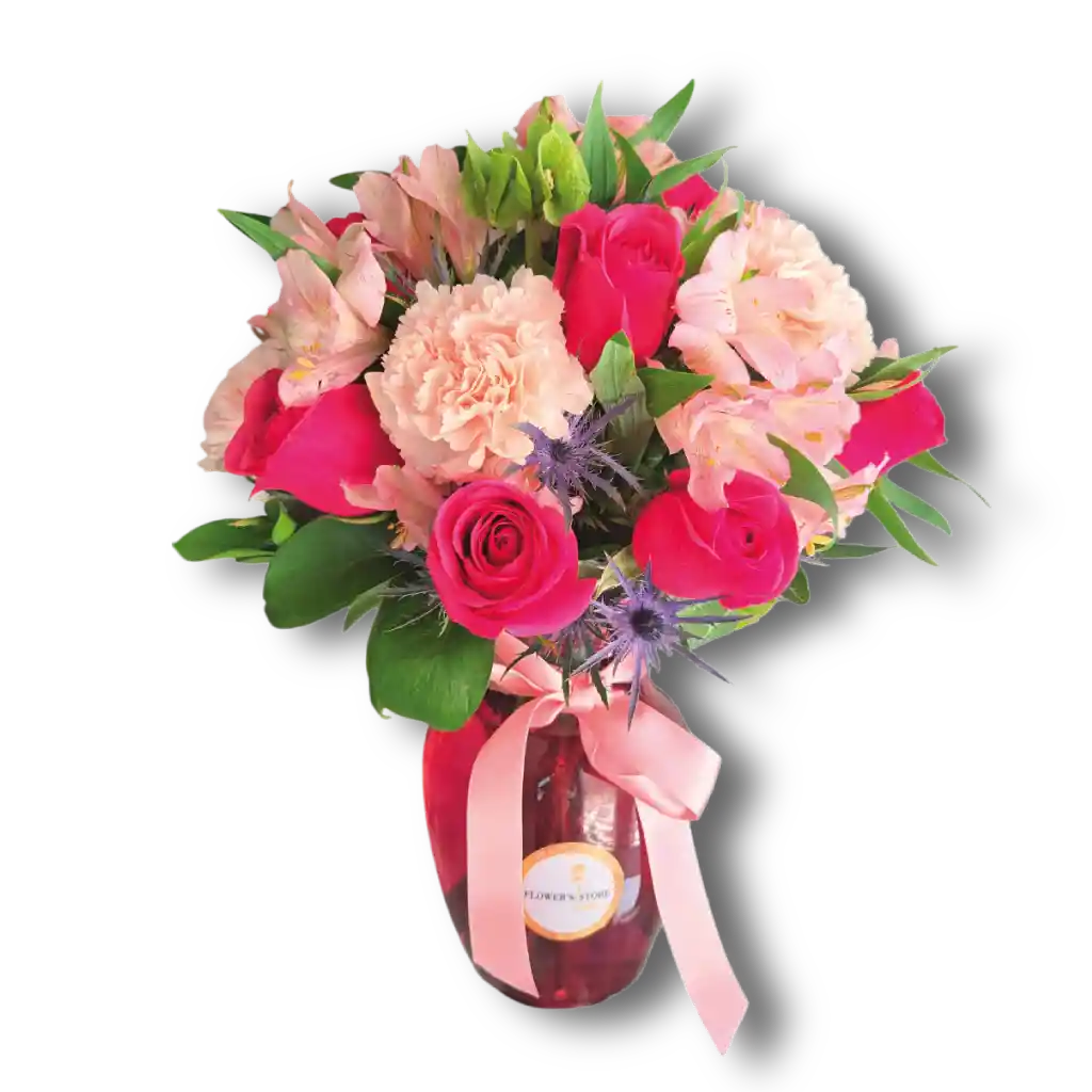 • Claveles • Rosas • Follaje • Florero de vidrio