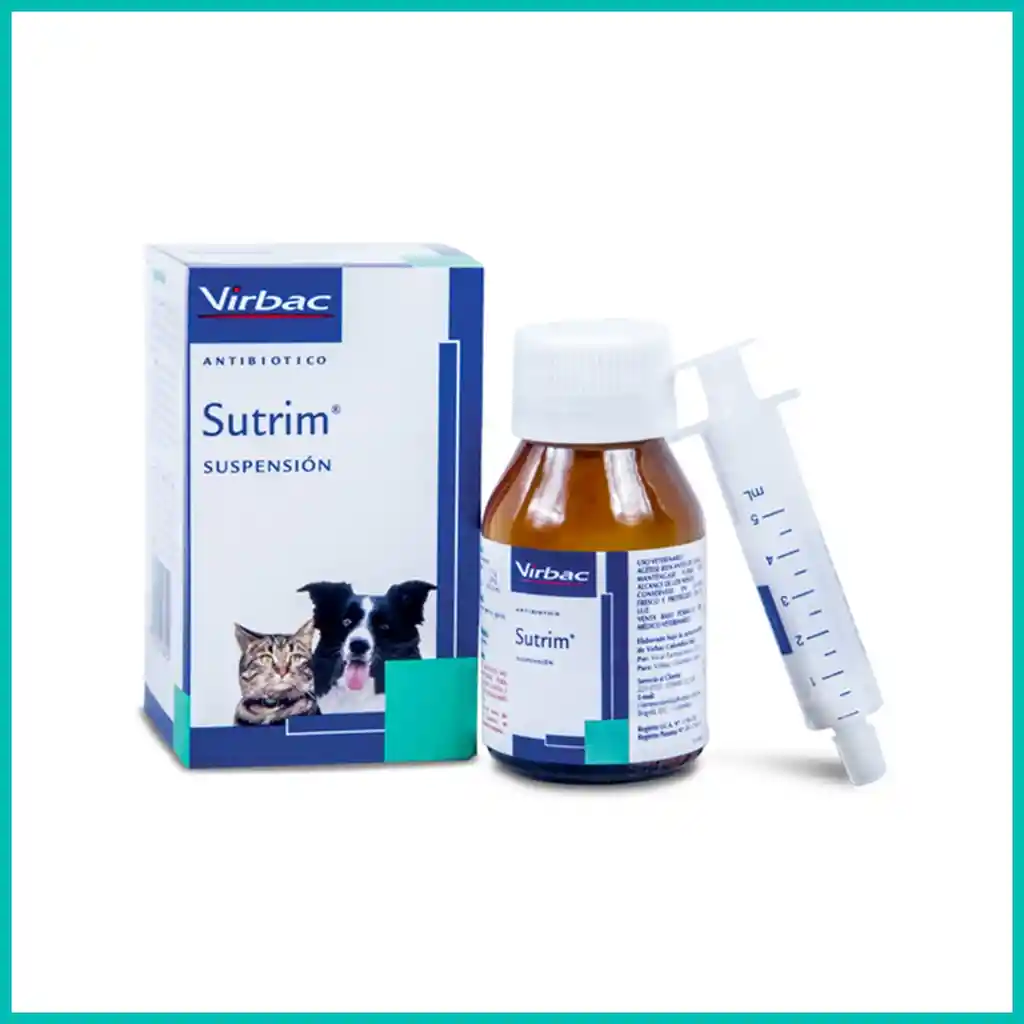 SUTRIM ANTIBIÓTICOS ORALES EN SUSPENSIÓN Antibacteriano de amplio espectro para caninos y felinos Indicaciones: Sutrim® es un antibacteriano que posee amplio espectro, esta asociación ejerce una acción bactericida frente a bacterias aerobias gram negativas y gram positivas y algunas anaeróbicas. De primer Orden: E. coli, Klebsiella sp., Pasteurella sp., Haemophilus sp., Proteus sp., Bordetella sp., Actinomyces sp., Salmonella sp., Shigella sp., Streptococcus sp. y Staphylococcus sp. Perros y Gatos Infecciones de las vías urinarias y oídos producidas por Staphylococcus sp, Streptococcus sp., Colibacilosis: producida por E. coli., Tos de las perreras ocasionada por Bordetella bronchiseptica, Actinomicosis y meningitis producida por Actinomyces sp, Nocardia sp., Prostatitis del perro ocasionada por E. coli, Staphylococcus sp, Streptococcus sp, Proteus sp, Pseudomona sp., Neumonías producidas por Pasteurella sp, Klebsiella sp, E. coli, Pseudomona sp, Staphylococcus sp, Streptococcus sp. Cerdos Colibacilosis de los recién nacidos y en post-destete producida por Escherichia coli., Salmonelosis producida por Salmonella sp., Meningitis producidas por E. coli. Aves Colibacilosis producida por E.coli, Colera Aviar Ocasionada por Pasteurella sp., Coriza producida por Haemophilus sp, Staphylococcus sp y Streptococcus sp. Composición Cada 100 mL contiene: Sulfadiazina base.................4.0 g Trimetoprim........................0.8 g Excipientes c.s.p.................100 g Especies Perros, Gatos, Cerdos y Aves. Dosis y administración Perros y Gatos: 1 mL / 3 Kg. de peso (15 mg/Kg) cada 12 horas durante 3 días. Vía Oral. Cerdos: 2 mL/ 3 Kg. de peso (30 mg/Kg) cada 12 horas durante 3 días. Vía Oral. Aves: 25 mg / Kg. de peso, durante 5 días. Vía Oral (Ver dosis para 100 aves.
