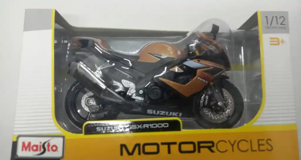 Espectacular Moto Modelo SUZUKI GSX-R1000 Escala 1/12 Pertenece a la coleccion Maisto Motorcycles Material metálico viene en empaque individual,es una coleccion de 12 motos, mide 18 cm de largo, (BMW R nineT Scrambler, SUZUKI V-Strom, DUCATI Hypermotar SP, DUCATI Diavel Carbon, BMW R 1200 GS, KAWASAKI Z900RS Cafe, KAWASAKI Ninja ZX-10R, HONDA CBR1000RR, HONDA CBR600RR, SUZUKI GSX-R1000, HUSQVARNA FE 501, KTM 1290 Super Duke R) Nos esmeramos en empacar muy bien nuestros productos. Recomendación: Mantener en un espacio fuera de humedad, para niños mayores de 8 años. Precaución: Puede contener piezas pequeñas que pueden causar asfixia. Atención utilizar bajo la vigilancia de un adulto.