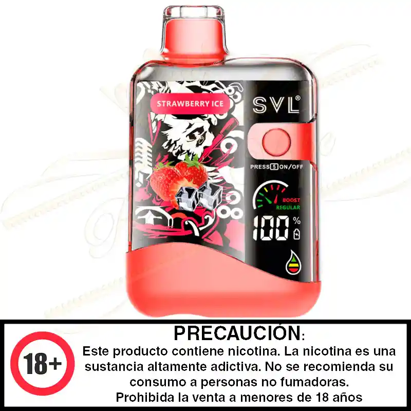 Dispositivo de vapeo desechable 12,000 caladas aproximadas Concentración de nicotina: 5% - 50mg por ml Sabor: Cereza mentolada Ingredientes: Glicerina vegetal, Propilenglicol, nicotina, Acido Benzoico y saborizantes artificiales El número de caladas puede variar de acuerdo a los hábitos de vapeo del usuario, entre más largas y profundas las inhalaciones menos cantidad de Caladas dura Material: PCTG Batería: 750 Mah reclargable (cable cargador no incluido) Contenido liquido: 18ml Incluye: 1 dispositivo desechable ADVERTENCIA Este producto contiene nicotina, una sustancia muy adictiva. No debe ser usado por mujeres embarazadas o personas con problemas respiratorios, no se recomienda su uso a no fumadores, mantener fuera del alcance de niños y mascotas, en caso de accidente consulte a su médico. Recuerda si no fumas no vepees, ESTE PRODUCTO PUEDE SER PELIGROSO Y PERJUDICIAL PARA LA SALUD. Vapear no es un juego ni una moda. Prohibida su venta a menores de edad.