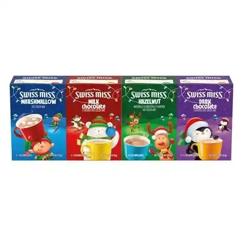 Set Caja Regalo Swiss Miss Cacao 4 Paquetes / 16 Unidades La colección Swiss Miss Hot Cocoa trae alegría y sabor en estas fiestas. Con cuatro fantásticos sabores: chocolate con leche, malvavisco, avellanas y chocolate amargo, hay algo para todos en su buena lista. 4 sabores diferentes de chocolate caliente incluidos 16 sobres de cacao. Incluye: 4 sabor chocolate con leche, 4 sabor malvavisco, 4 sabor avellana y 4 sabor chocolate negro. Sabor cremoso y suave. 1,38 onzas. bolsas. Peso neto: 22,08 onzas | Guardar en lugar fresco y seco, Garantía del vendedor: 12 meses