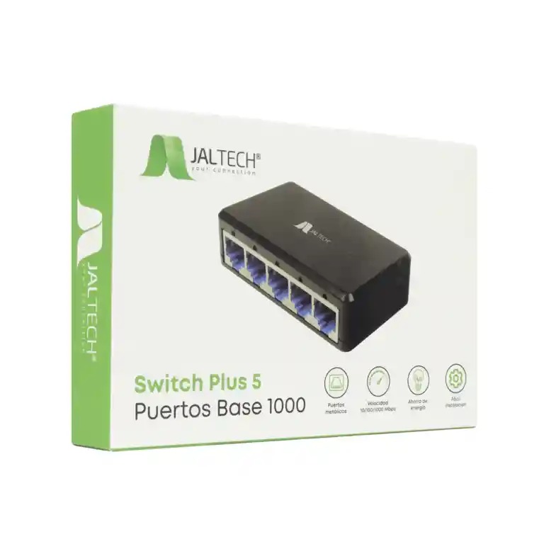 · Switch 5 puertos base 1000 · Número de puertos:5 · Tipo de puertos: RJ45 · Velocidad: 10/100/1000 Mbps · Auto negociación · Con regulación de flujo de datos · Auto MDI/MDIX · Plug and play · Con acople para instalación en paredes y techos · Puertos metálicos · Disipación de calor en los chips · Ahorro de energía mayor al 70% · Adaptador:5V/0.5A · Longitud de cable: 93 cm · Material de carcasa: ABS · Dimensiones: 82 mm x 21.5 mm x 46.3 mm · Peso: 45 gr.