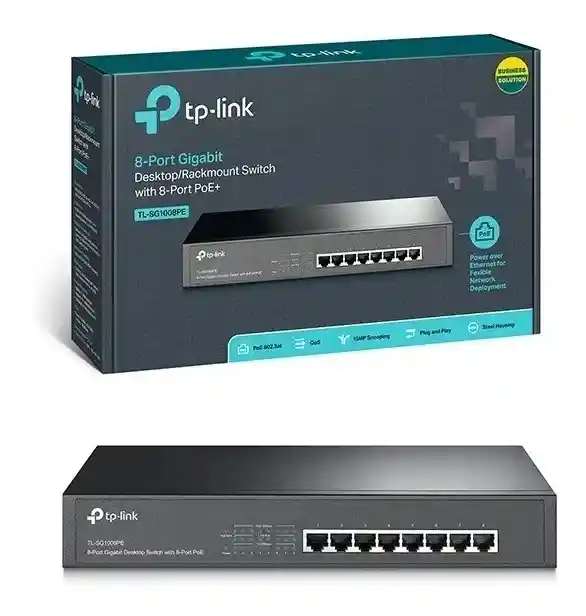- Para qué sirve este producto El TL-SG1008PE es un switch para montaje de Sobremesa/Bastidor con 8 puertos Gigabit con soporte del estándar PoE+. Proporciona una manera sencilla de expansión para una red cableada transportando alimentación y datos sobre un único cable Ethernet. Con un presupuesto total de potencia de 124W, hasta 30W por puerto, el TL-SG1008PE puede alimentar dispositivos de más potencia como Puntos de Acceso (APs) inalámbricos, cámaras IP o teléfonos IP. Además, con su innovadora tecnología de eficiencia energética, el TL-SG1008PE puede ahorrar hasta un 75% del consumo eléctrico, convirtiéndolo a una solución eco-amigable para su red empresarial. - 8 puertos RJ45 a 10/100/1000Mbps - Equipado con 8 puertos con soporte PoE+ para transferir datos y alimentación sobre un único cable - Al trabajar con dispositivos compatibles con IEEE 802.3af/at, amplía las redes domésticas o de oficina - Innovadora tecnología de eficiencia energética que reduce el consumo eléctrico en hasta un 75%* - Soporte de estándar PoE+ con un totañ PoE de 126W, 30W por puerto. - Diseño plug and play, No necesita configuración
