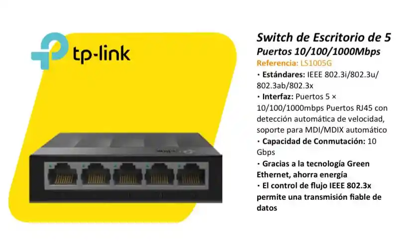 • Estándares: IEEE 802.3i/802.3u/ 802.3ab/802.3x • Interfaz: Puertos 5 x 10/100/1000mbps Puertos RJ45 con detección automática de velocidad, soporte para MDI/MDIX automático • Capacidad de Conmutación: 10 Gbps • Gracias a la tecnología Green Ethernet, ahorra energía • El control de flujo IEEE 802.3x permite una transmisión fiable de datos EXPOTECNOLOGIA 3505945136