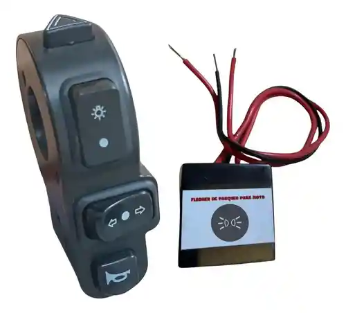 Switch de Direccionales para Moto + Flasher de Parqueo Universal Mejorá la señalización y seguridad de tu motocicleta con este práctico combo de switch de direccionales + flasher de parqueo universal, ideal para controlar las direccionales y activar luces de emergencia cuando lo necesites. Perfecto para reemplazo o para instalar un sistema de luces intermitentes de parqueo en diferentes modelos de motos.