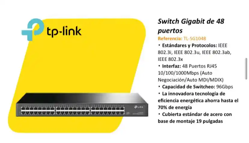 • Estándares y Protocolos: IEEE 802.31, IEEE 802.3u, IEEE 802.3ab, IEEE 802.3x • Interfaz: 48 Puertos RJ45 10/100/1000Mbps (Auto Negociación/Auto MDI/MDIX) • Capacidad de Switcheo: 96Gbps • La innovadora tecnología de eficiencia energética ahorra hasta el 70% de energía • Cubierta estándar de acero con base de montaje 19 pulgadas EXPOTECNOLOGIA 3505945136
