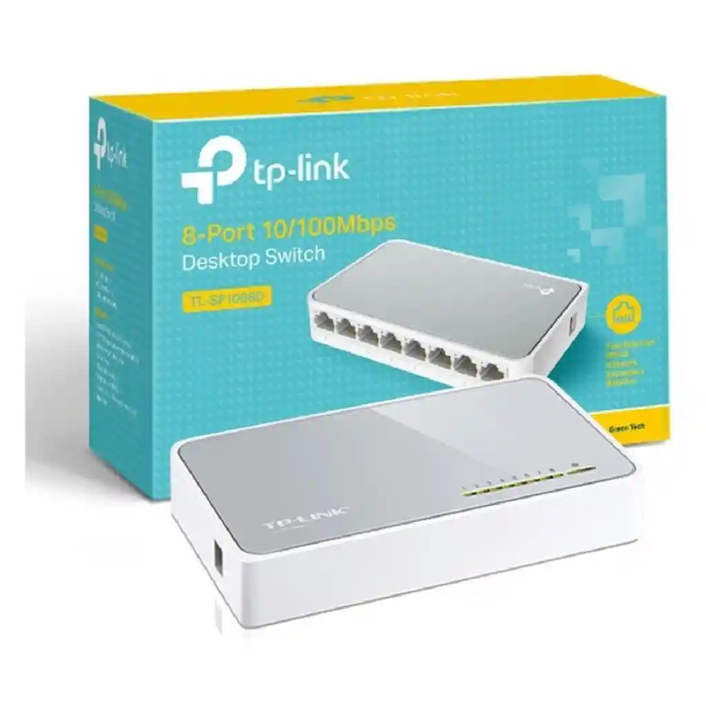 Switch De Escritorio De 8 Puertos 10/100 Tp-link Tl-sf1008d 8 puertos RJ45 de auto-negociación de10/100Mbps, soporta auto MDI/MDIX La tecnología Green Ethernet ahora energía hasta del 60% El control de flujo de IEEE 802.3x proporciona una transferencia de datos confiable Cubierta de plástico, diseño de escritorio Plug and play (conecte y use), no se requiere configuración