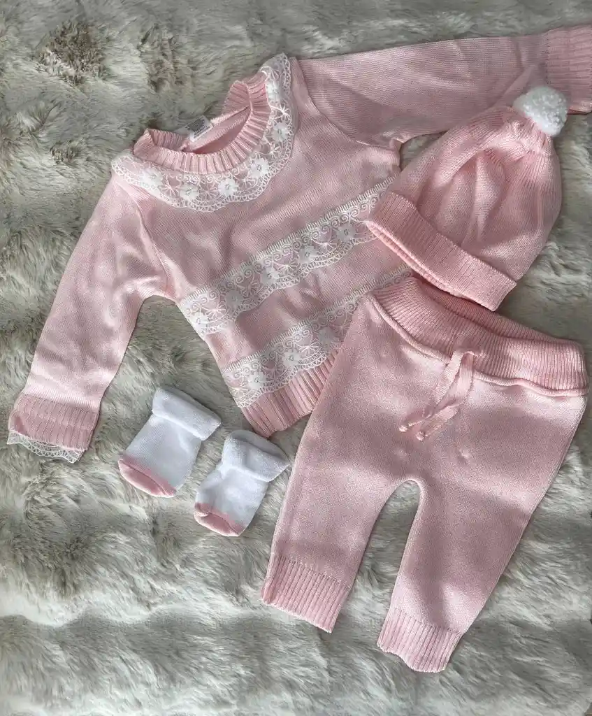 "T. 0-3M - Set de Hilo Rosado: Conjunto de ropa para bebé de 0 a 3 meses, confeccionado en hilo suave y delicado en tonos rosados. Ideal para mantener al bebé cómodo y abrigado." Referencia: 00098