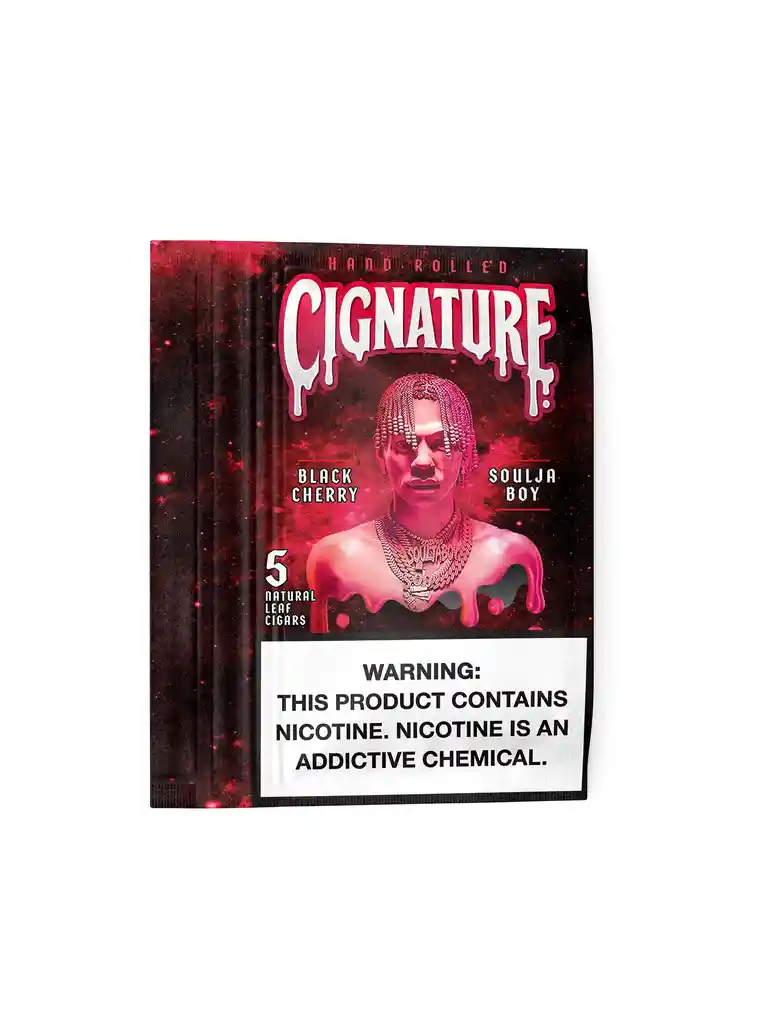 Cignature de Soulja Boy Black Cherry Cigars 5 cigarros enrollados a mano de hoja natural Sabor: Cereza Negra Cantidad: 5 cigarros Producido en República Dominicana. Tabaco 100% Importado. Este producto contiene nicotina. La nicotina es una sustancia química adictiva. El tabaco es nocivo para la salud. Ley 30 de 1986. Verificar condiciones de uso, indicaciones y contraindicaciones en la etiqueta. Prohibida la venta a menores de edad