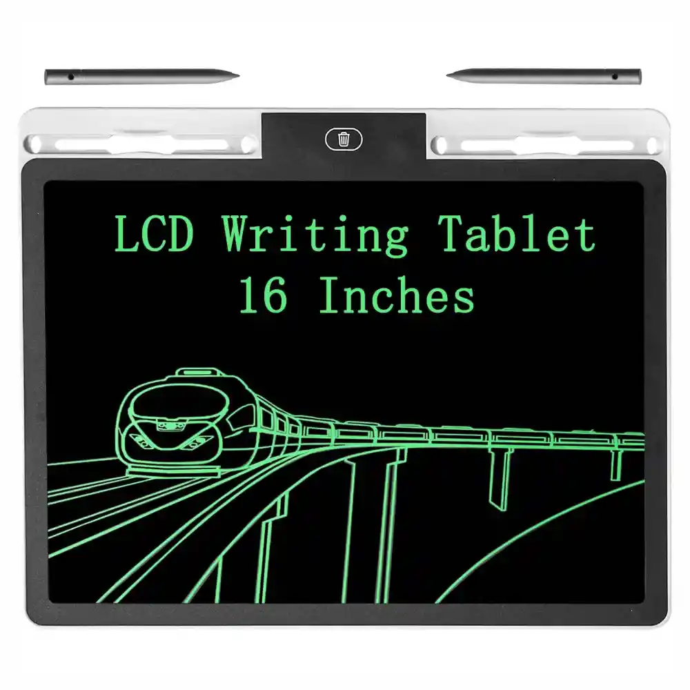 Pantalla grande de 16 pulgadas mejorada y protección ocular: nuestro bloc de notas electrónico LCD adopta la última tecnología LCD flexible de alta tecnología y una pantalla LCD suave y flexible. La gran pantalla LCD de 16 pulgadas sin luz azul no emite luz, imitando tinta real en papel y evitando la fatiga ocular. No te preocupes por el polvo, la tinta o el deslumbramiento, seguro, limpio y cómodo. Fácil de usar y requiere bajo consumo de energía: Escribe en cualquier momento sin encendido/apagado. Haga clic en el botón "Eliminar" y el contenido de la pantalla desaparecerá. El interruptor deslizante "lock" evita la eliminación accidental. Nuestra tableta LCD de 16 pulgadas tiene un ciclo de vida de 100,000 ciclos y solo requiere una pequeña cantidad de energía para borrar. La batería CR2032 incorporada se puede utilizar durante aproximadamente un año, y luego un pequeño destornillador puede completar el reemplazo, ¡conveniente y rápido! Múltiples aplicaciones: el bloc de escritura LCD para niños y adultos es ideal para escribir listas de comestibles, listas de tareas y recetas; tomar algunas notas al azar; bocetar, escribir y garabatear, dejar notas de oficina u otra información. También es un gran regalo para niños, estudiantes, diseñadores, hombres de negocios, profesores y artistas. Juguetes educativos de aprendizaje mientras juegas: proporciona un amplio espacio para garabatos y una fácil visualización, liberando la imaginación de tu hijo para una mejor experiencia de aprendizaje preescolar o en casa Lo que obtienes en la compra 1 x Tablero Magic Pad 2 x Lápiz de dibujo 1 x Caja de embalaje