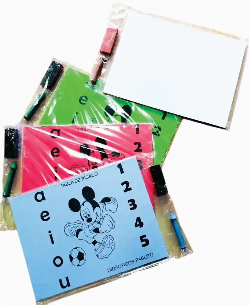 Son herramientas escolares versátiles diseñadas para estimular el aprendizaje y la motricidad fina en niños. Una cara de la tabla es acolchada (fomi o caucho-espuma) para actividades de picado o punzado con un punzón. La otra cara es una superficie acrílica o de fórmica que funciona como pizarra borrable para usar con marcadores o para modelar con plastilina. Incluyen un punzón ergonómico de punta roma y un borrador para el tablero acrílico