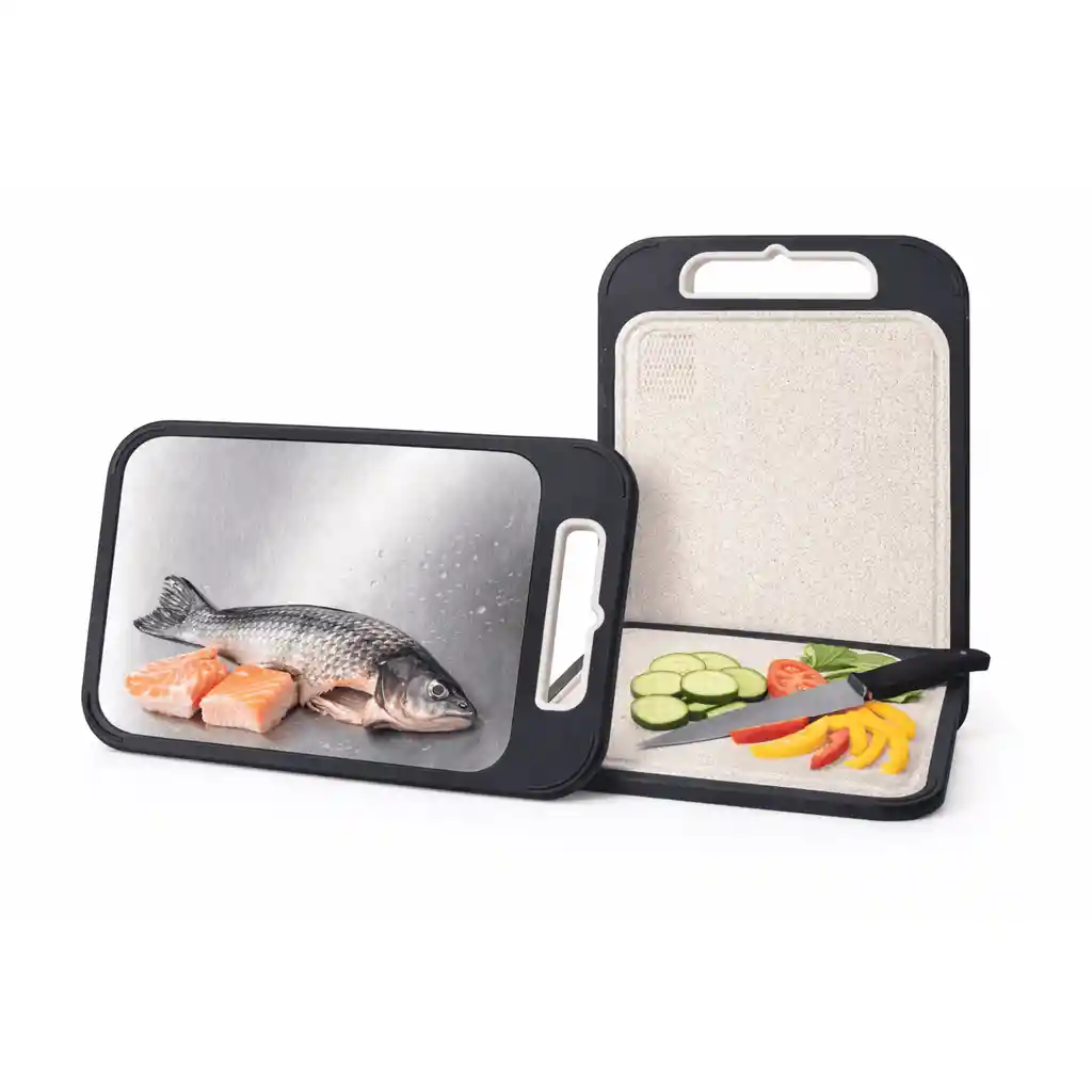Mejora tu experiencia en la cocina con esta tabla de cortar profesional de doble cara, diseñada para ofrecer máxima higiene, durabilidad y funcionalidad. Es una opción ideal tanto para uso doméstico como para cocinas profesionales que exigen materiales resistentes y seguros para los alimentos. Está fabricada en acero inoxidable SUS 304 de grado alimentario, combinado con plástico PP de paja de trigo, un material más ecológico, resistente y seguro. Su superficie es antimoho, antibacteriana y no porosa, lo que evita la absorción de olores, líquidos y residuos de alimentos, manteniendo una higiene superior en cada uso. Diseño funcional y versátil Cuenta con doble cara, lo que permite separar el corte de carnes, verduras, frutas o alimentos cocidos, ayudando a prevenir la contaminación cruzada. Su mango integrado facilita el agarre y el traslado, haciendo el trabajo en la cocina más cómodo y seguro. Fácil limpieza y mantenimiento Gracias a su superficie lisa, la limpieza es rápida y eficiente. Puede lavarse en lavavajillas, lo que garantiza una desinfección profunda sin deteriorar el material. Resistencia y larga vida útil Su estructura robusta asegura un rendimiento duradero incluso con uso frecuente. No se deforma, no se quiebra y conserva su diseño moderno con el paso del tiempo. Especificaciones técnicas Nombre: Tabla de cortar Material: Acero inoxidable SUS 304 + plástico PP de paja de trigo Tamaño: 350 × 250 × 10 mm Peso neto: 773 gramos Diseño: Estilo moderno, elegante y funcional Embalaje: Caja de regalo Ideal para Cortar verduras, frutas, carnes y alimentos cocidos Cocinas modernas, hogares y uso profesional Personas que buscan higiene, resistencia y diseño en un solo producto Regalo práctico y funcional para el hogar Una tabla de cortar de alto nivel, pensada para quienes valoran la limpieza, la seguridad alimentaria y la durabilidad en la cocina. Que viene con mi compra? 1 Unidad Tabla De Picar.