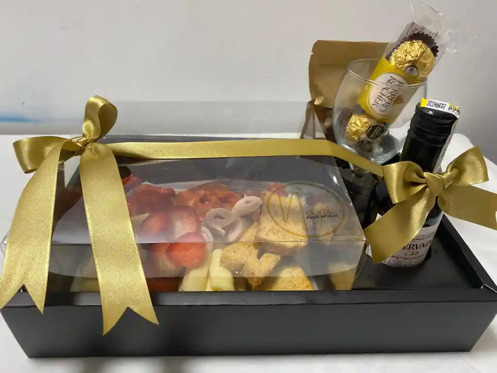Tabla de queso más vino mini, copa, bolsa de pistachos y chocolate ferrero Rocher Color de cajas: Rosada, dorada o negra, pregunta por la de tu preferencia, o disponibilidad en la tienda.