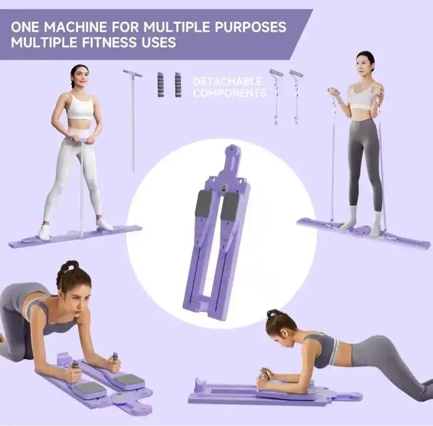 -Diseño compacto y plegable: La base se pliega para un fácil almacenamiento y transporte. -Manillas extraíbles: Para flexiones (push-ups), fácilmente ajustables en diferentes posiciones. -Barras con bandas elásticas: Permiten trabajar fuerza en brazos, espalda, pecho y piernas (como si fuera una máquina de remo o poleas). -Soporte antideslizante: Superficie firme para mantener estabilidad durante el ejercicio. -Accesorios incluidos: Manillas, bandas de resistencia y agarraderas tipo cuerda con soporte. Ejercicios que permite hacer: -Flexiones -Remo con bandas -Ejercicios de bíceps/tríceps -Sentadillas con resistencia -Plancha (core) -Trabajo abdominal y lumbar Ideal para: -Entrenamientos en casa -Personas con poco espacio -Rutinas full body -Tonificación, fuerza y resistenci