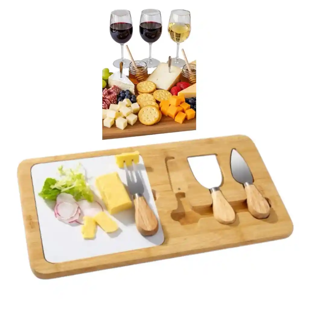 Eleva tus reuniones, cenas y celebraciones especiales con esta excepcional tabla para quesos retangular que combina elegancia premium y máxima funcionalidad. Fabricada con materiales de alta calidad y un diseño moderno, es la plataforma perfecta para desplegar una sofisticada presentación de quesos, embutidos, frutas y aperitivos, garantizando una impresión memorable. Estas herramientas esenciales están diseñadas para cortar, untar y servir con precisión cualquier variedad de queso, desde los blandos y cremosos hasta los duros y curados. Transforma la forma de servir quesos, embutidos y aperitivos en una experiencia de lujo. Medidas 36.5x18.9x2cm