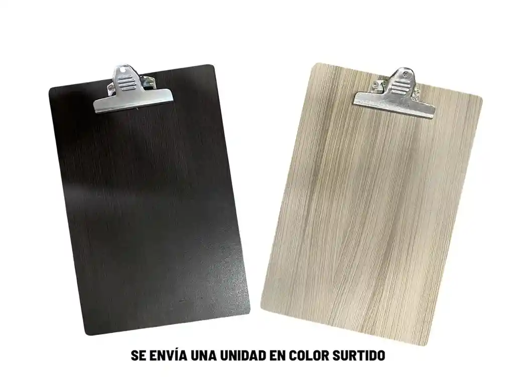 Tabla de apoyo elaborada en madeflex, calibre grueso para dar una mayor resistencia al quiebre, superficie lisa, plana y sin imperfecciones, con gancho metálico para la sujeción de los papeles.