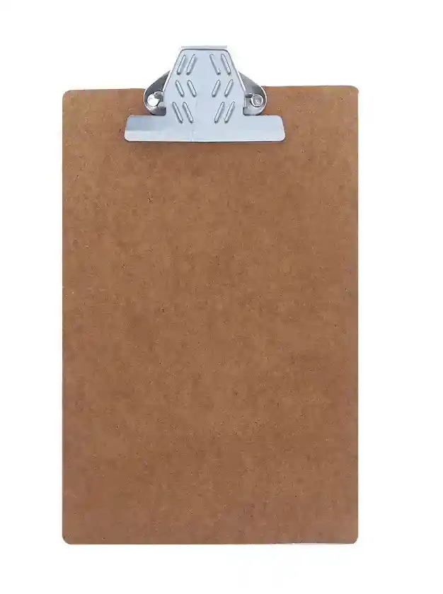 Tabla de apoyo elaborada en madeflex, calibre grueso para dar una mayor resistencia al quiebre, superficie lisa, plana y sin imperfecciones, con gancho metálico para la sujeción de los papeles.