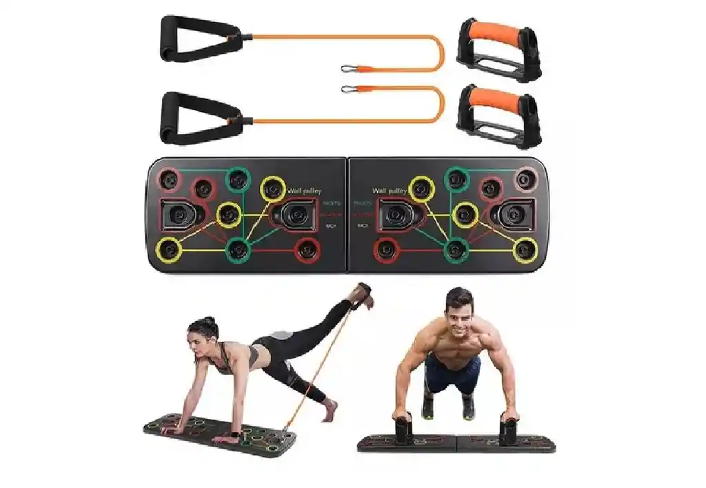 "Tabla Push Up todo tipo de flexiones + Bandas de Estiramientos (Sistema de colores)" La tabla de flexiones está hecha de plástico ABS de alta calidad, que puede manejar entrenamientos más intensos. La banda de resistencia está hecha de látex natural, que es duradero y ecológico. El mango antideslizante proporciona un agarre firme y reduce la posibilidad de lesiones en las articulaciones. También se han agregado almohadillas antideslizantes para ayudar a estabilizar la tabla de flexiones durante el ejercicio. ¿PARA QUE ME SIRVE EL PRODUCTO? La tabla de flexiones plegable cuenta con un sistema codificado por colores, múltiples posiciones de flexiones para trabajar de manera eficiente sus diferentes grupos musculares, incluidos el pecho, los hombros, los tríceps, los bíceps, la espalda e incluso los músculos de todo el cuerpo. mientras trabaja su núcleo. CARACTERISTICAS: •Material: ABS •La tabla de flexiones multifuncional puede ayudar a dar forma a su pecho, caderas, hombros, espalda y tríceps. •Las asas antideslizantes son más cómodas y más seguras para el ejercicio, la parte inferior antideslizante hace que la placa de empuje hacia arriba sea más estable. •Placa de alta calidad completamente ensamblada con agarre antideslizante de silicona, cada pieza está cuidadosamente construida para resistir atascos y roturas para un ejercicio más seguro. •El tablero es plegable y portátil, fácil de montar y almacenar. Fácil de usar, simplemente inserte el mango en la posición deseada. • Es adecuado para su uso en casa, oficina, gimnasio o uso de viaje. Tablas de flexión codificadas por color para objetivos específicos de trabajo muscular (hombro rojo, espalda amarillo y tríceps verde). Sistemas de empujes pesados por “interpolación o presión” con múltiples posiciones y ángulos, capaces de moldear y maximizar la resolución de la parte superior. Incluye: -Bandas tubulares para trabajar los hombros y la espalda con diferentes ejercicios, también bíceps y piernas y glúteos. CONTENIDO: 1 Tabla Para Flexiones Push Up