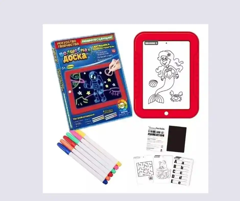 TABLETA MAGIC PAD O PIZARRA MAGICA PARA LOS PEQUEÑOS DE LA CASA! SE DIVERTIRAN DIBUJANDO Y CREANDO TODO LO QUE IMAGINEN, DONDE HARÁN DEL APRENDIZAJE UN MOMENTO DIVERTIDO. ¡La diversión y creatividad se juntan con Magic Pad, cómprala hoy! CARACTERÍSTICAS MAGIC PAD -Pantalla transparente reusable. -06 rotuladores neón (NO tóxicos) 6 colores. No doble punta. -30 plantillas con diferentes diseños: Plantilla de dibujo de sirena, perro, gato, unicornio, astronauta, dinosaurio triceratops, tortuga, hormiga, oso. Plantillas de operaciones matemáticas, sumas, restas, laberintos, conexiones de números, trazo de números. Plantillas de lectura; búsqueda de palabras, sopa de letras, trazo de formas, triqui, líneas de cuadrícula, trazo de letras mayúsculas y dibujo libre cn plantilla en fondo negro. Todo esto iluminado por luz led! -01 paño de limpieza -01 guía de juego. -Funciona con 2 pilas AA (no incluidas) -Tiene Luces Led de hasta 8 efectos diferentes. GARANTIA DE 30 DIAS DIRECTAMENTE CON NOSOTROS POR CUALQUIER DEFECTO DE FABRICA QUE LLEGUE A PRESENTAR EL PRODUCTO, LA GARANTIA NO APLICA PARA PRODUCTOS GOLPEADOS, MOJADOS, ROTOS O MAL MANIPULADOS. 1. Para hacer efectiva la devolución, el producto debe entregarse debidamente protegido cuidando el estado del empaque original, incluir todos los documentos y/o manuales (si aplica) y las partes completas.
