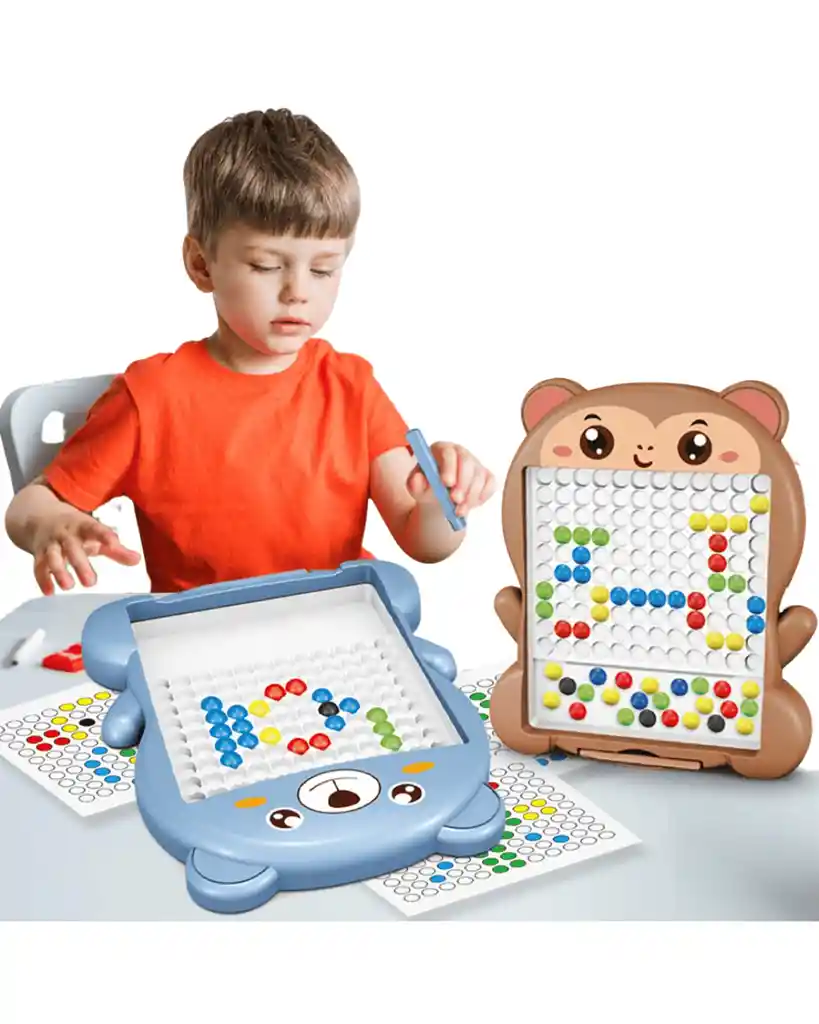 Este encantador juguete educativo con forma de osito está diseñado para estimular la motricidad fina, el reconocimiento de colores y la coordinación mano-ojo en los más pequeños. Con un tablero perforado de diseño amigable y fichas de colores vibrantes, los niños podrán crear patrones, desarrollar la imaginación y reforzar habilidades esenciales mientras juegan.
