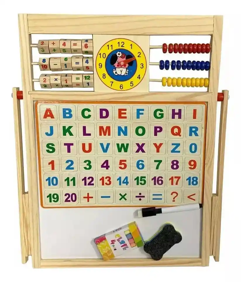 Tablero Didáctico Doble Magnético juguete niños aprendizaje • Tablero con múltiples funciones. • Plegable. • Abecedario completo imanado. • Una cara del tablero es de acrílico para marcador borrable y la otra para tizas. • Ayuda al desarrollo intelectual, motor y lógico de tu niño o niña. • Accesorios : caja de tizas con 3 colores, borrador, marcador borrable Modelo Tablón Trípode Medidas: 38.5cm de ancho x 45 cm de alto Otras características Materiales de la superficie: Madera Materiales del armazón: Madera