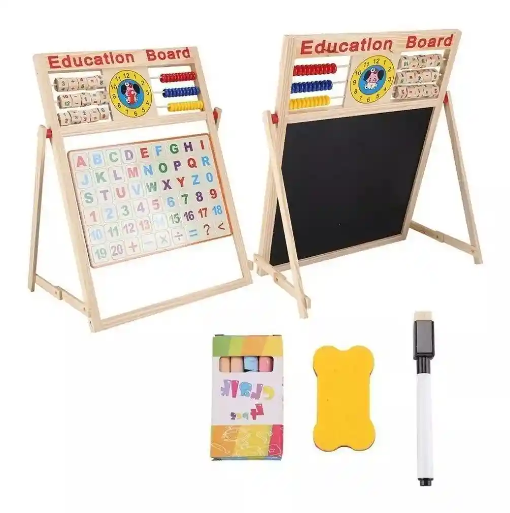 El Tablero didáctico 2 en 1 borrable y de tiza para niños Gigante es un juguete educativo multiusos diseñado para estimular el aprendizaje y la creatividad en los más pequeños. Fabricado completamente en madera, es seguro para niños mayores de tres años y cuenta con dos caras: una para dibujar con tiza y otra para usar marcadores y jugar con letras, números y signos magnéticos. Incluye soporte plegable para mayor comodidad y es ideal para mejorar la coordinación, el aprendizaje y la formación de palabras o resolución de operaciones matemáticas de manera divertida. Perfecto para uso en hogares, escuelas o guarderías, este tablero combina diversión y educación en un solo producto. /// Contenido de la caja: Borrador, tablero, fichas magnéticas, marcadores y tiza /// Ficha Técnica: Materiales : Madera - Plástico Dimensiones: 43.5 cm x 35 cm x 21.5 cm Edad recomendada : + 3 años en adelante Material suave, cómodo, seguro, no tóxico Certificado de conformidad: SL-CS-210044 Referencia: DM1035 ** _Para defectos de fábrica o retractos: \\_Por favor revise el producto apenas lo reciba y antes de usarlo. No aplican ley de retracto o defectos de fábrica luego de usar el producto. Se manejan máximo 5 días para reportar defectos de fábrica (por ejemplo, producto funciona mal, piezas faltantes, rotas, etc). Para hacer efectiva la devolución el producto debe devolverse con el empaque original, el cual debe estar en buen estado, incluir todos los documentos y las partes completas y sin daños.