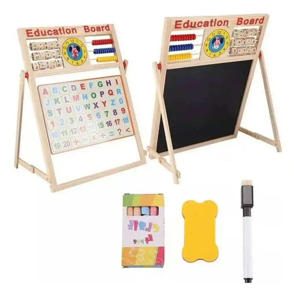El Tablero didáctico 2 en 1 borrable y de tiza para niños Gigante es un juguete educativo multiusos diseñado para estimular el aprendizaje y la creatividad en los más pequeños. Fabricado completamente en madera, es seguro para niños mayores de tres años y cuenta con dos caras: una para dibujar con tiza y otra para usar marcadores y jugar con letras, números y signos magnéticos. Incluye soporte plegable para mayor comodidad y es ideal para mejorar la coordinación, el aprendizaje y la formación de palabras o resolución de operaciones matemáticas de manera divertida. Perfecto para uso en hogares, escuelas o guarderías, este tablero combina diversión y educación en un solo producto. /// Contenido de la caja: Borrador, tablero, fichas magnéticas, marcadores y tiza /// Ficha Técnica: Materiales : Madera - Plástico Dimensiones: 44 cm x 34 cm Edad recomendada : + 3 años en adelante Material suave, cómodo, seguro, no tóxico Certificado de conformidad: SL-CS-210044 Referencia: DM533 ** _Para defectos de fábrica o retractos: \\_Por favor revise el producto apenas lo reciba y antes de usarlo. No aplican ley de retracto o defectos de fábrica luego de usar el producto. Se manejan máximo 5 días para reportar defectos de fábrica (por ejemplo, producto funciona mal, piezas faltantes, rotas, etc). Para hacer efectiva la devolución el producto debe devolverse con el empaque original, el cual debe estar en buen estado, incluir todos los documentos y las partes completas y sin daños.